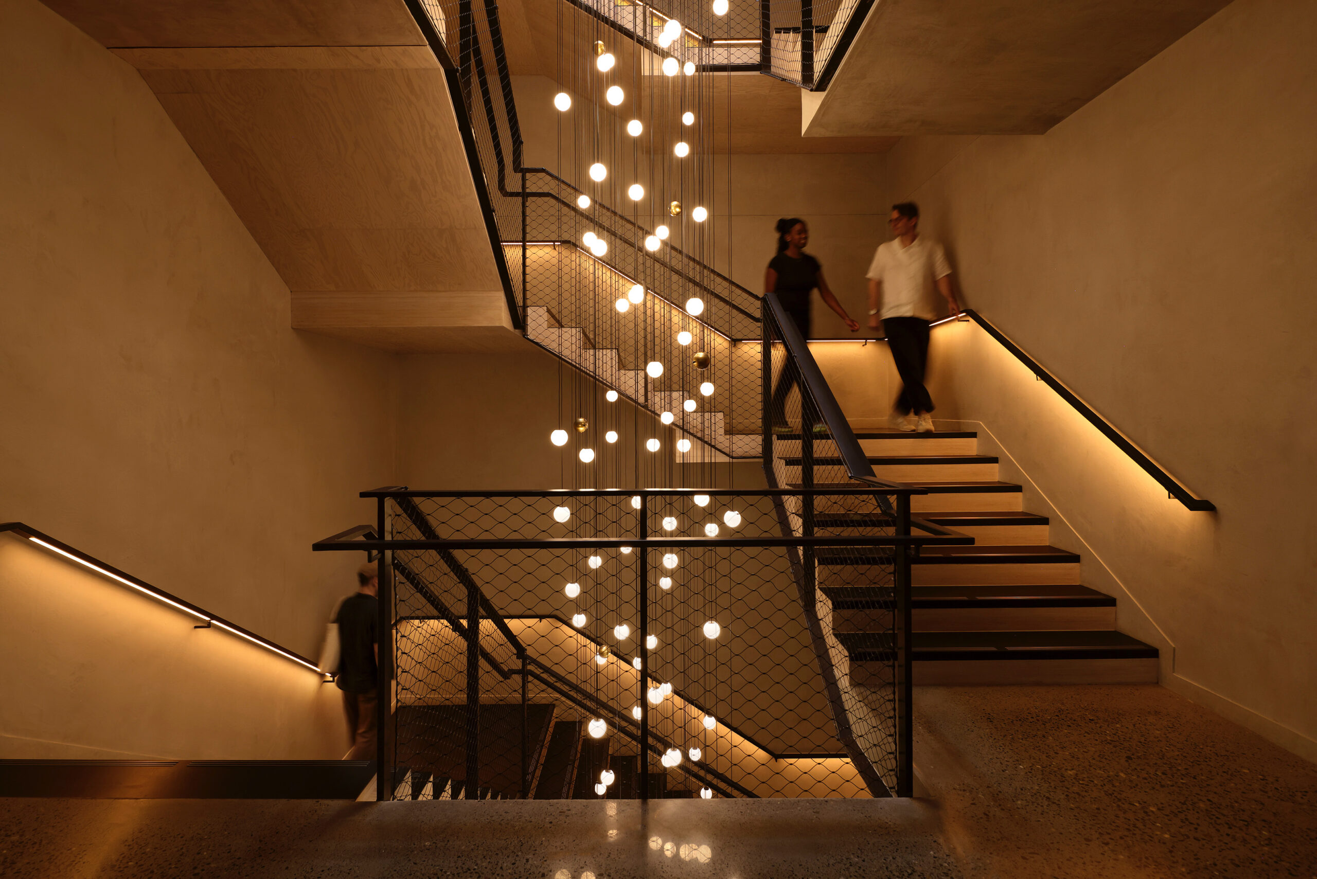 Graypants completed a project at Hotel Cascada in Portland, a wellness-focused hotel where experience and atmosphere play a big role. In the stairwell, we installed a custom Loci Globe setup in glass. By combining globes in different hanging heights, they turned what is normally just a functional space into a strong visual feature that runs through the full height of the building. The glass works nicely with the daylight coming in from above, while in the evening it creates a warm and glow.