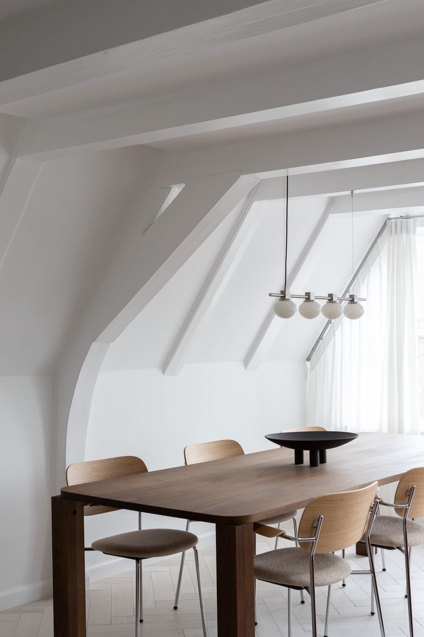 Apartment Herengracht Interior Design: Mel Interiors Products: Frama Ovoid Lighting and Rivet, Symmetry Furniture Collection Inspired by the sophisticated ambiance of airport lounges, Mel Interiors carefully studied the design principles and the psychology behind their color palettes to bring this vision to life. Shades of blue evoke calmness, reliability, and trust, creating a soothing atmosphere. White enhances openness, making the space feel airy and expansive. Gray and stainless steel add a modern, high-tech aesthetic, reinforcing durability and sleekness. The Frama Rivet collection, crafted from raw aluminium, and the Ovoid lighting series, featuring stainless steel with handblown glass, integrate effortlessly into this vision. Their clean lines and refined finishes echoing the architectural precision and contemporary elegance of the space. To balance these cool tones, they introduced earthy hues like cognac and brown, bringing warmth and sophistication. By thoughtfully integrating these elements, they designed a space that embodies this passion while maintaining a perfect harmony between elegance and functionality.